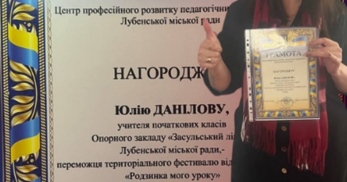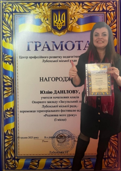Вітаємо вчительку початкових класів Юлію Данілову, яка здобула перемогу (І місце) в територіальному фестивалі відеофрагментів "Родзинка мого уроку". Це закономірний результат постійного творчого пошуку педагога, яка намагається кожне заняття наповнити цікавими моментами пошуку та відкриттів. Бажаємо Юлії Дмитрівні, щоб зерна, які вона щедро сіє в душах вихованців, проросли спільними успіхами на життєвій стежині!