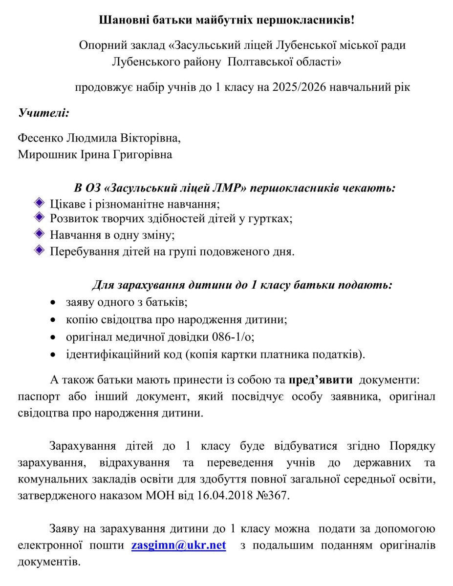 Набір учнів до 1 класу на 2025/2026 навчальний рік