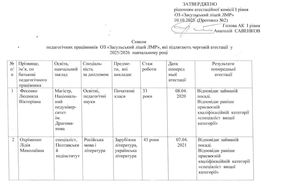 Графік засідань атестаційної комісії I рівня Опорного закладу "Засульський ліцей Лубенської міської ради Лубенського району Полтавської області" на 2025/2026 навчальний рік
